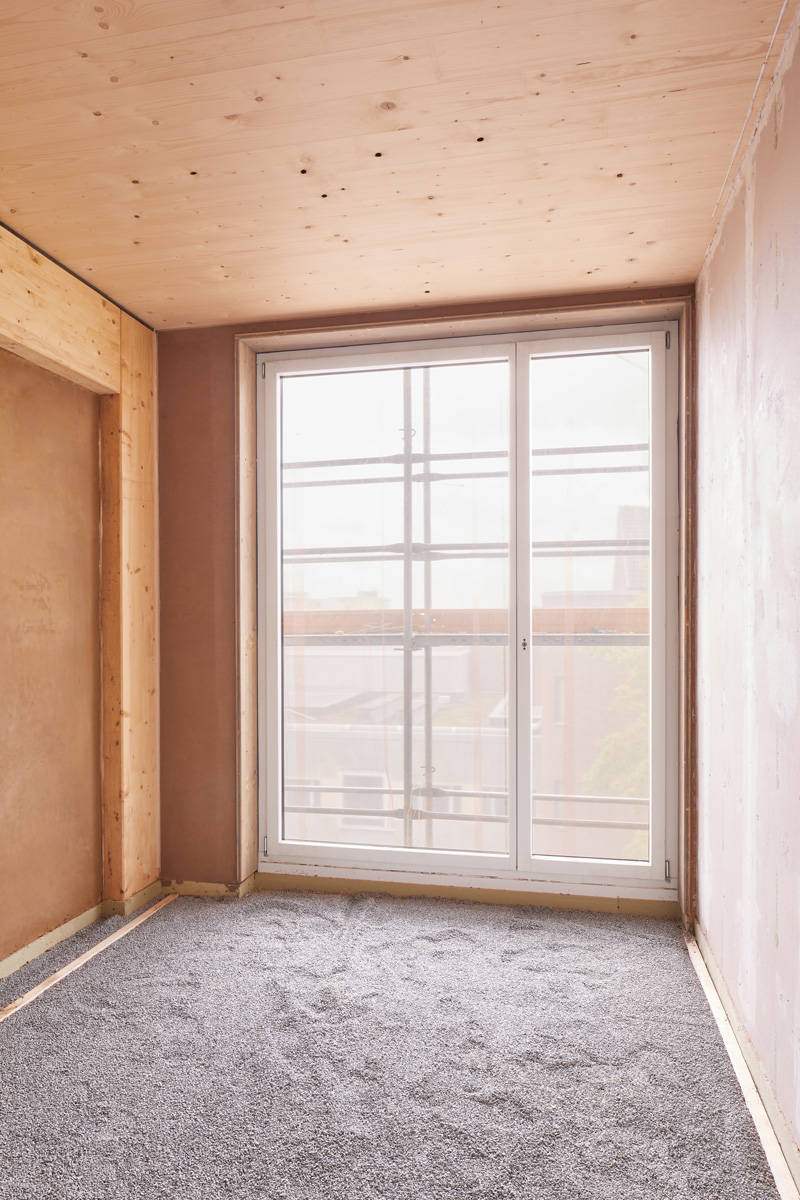 Leitthema für das CRCLR-Haus ist die zirkuläre Bauweise. Vor Ort gefundene Materialien werden wieder verwendet. Die alten Dachträger, gebrauchte Fassadenplatten, nahezu neue Fenster finden hier unter anderem eine 2. Verwendung.