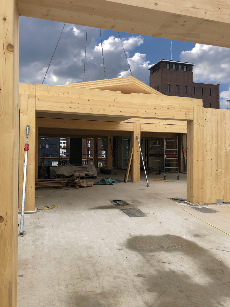 Die bestehende Halle wird in modularer Holztafelbauweise aufgestockt und erweitert. Gemeinschaftliches Wohnen, gewerbliches Wohnen und eine Büronutzung entstehen auf dem Bestand. Dieser wird als Veranstaltungsort, Coworking-Space sowie Künstleratelier entwickelt.