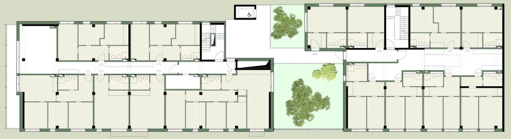 Die Aufstockung gliedert sich in drei Bereiche. Das Haus West dient dem Wohnen, das Haus Ost wird eher gewerblich genutzt und dazwischen liegt das Gewächshaus, welches noch nicht umgesetzt werden konnte und die Erschließungsebenen als kommunikatives Herz des Gebäudes.