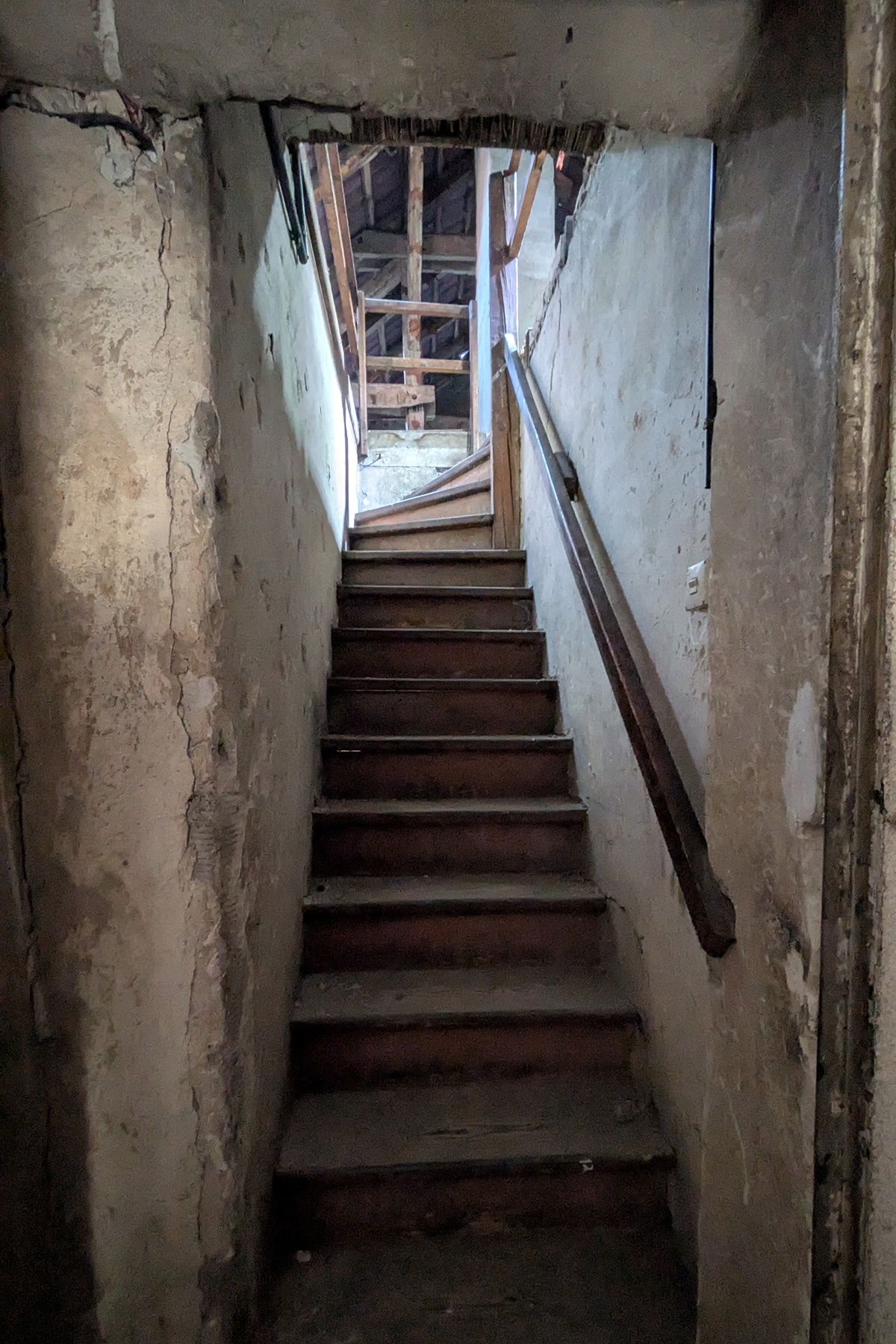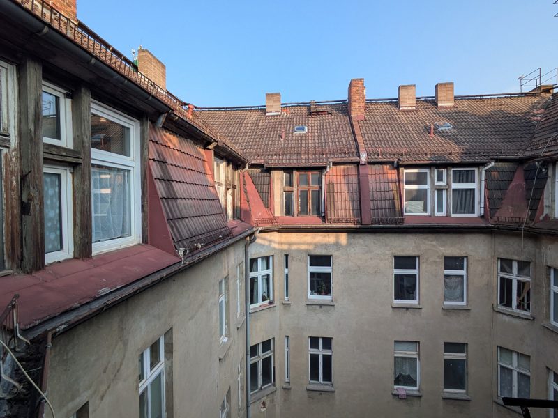 Das Gebäude bildet seinen eigenen Block: Ein Gebäude mit 4 Zugängen steht frei auf einem Grundstück und organisiert sich gleichmäßig verteilt um eigenen Hof. Die unteren Geschosse sind im klassischen Mauerwerksbau, während das oberste Wohngeschoss als Fachwerksbau errichtet wurde. Darüber befindet sich ein weiterer großzügiger Dachraum.