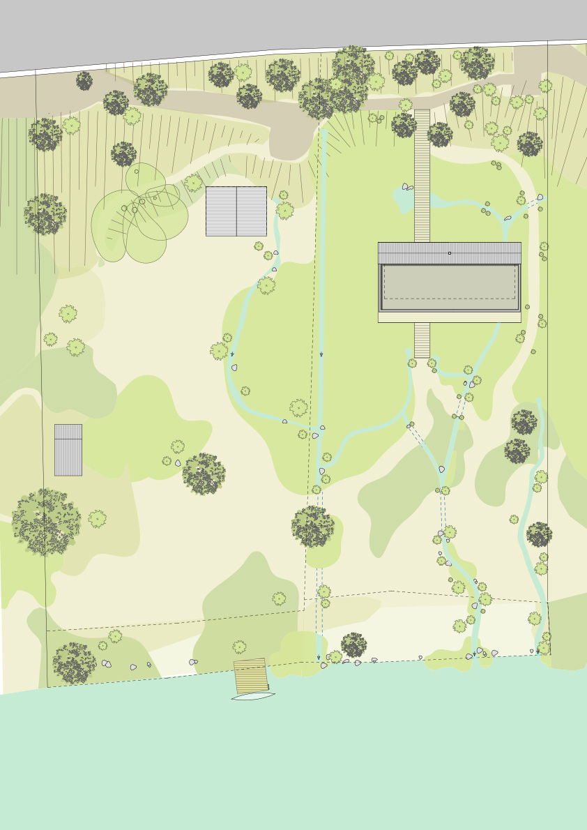 Das teils in den Hang eingegrabene untere Geschoss ist aus Sichtbeton geplant. Darauf steht ein Holzhaus, welches wie das Haus nebenan mit dunkelgrauem Trapezblech verkleidet wird.