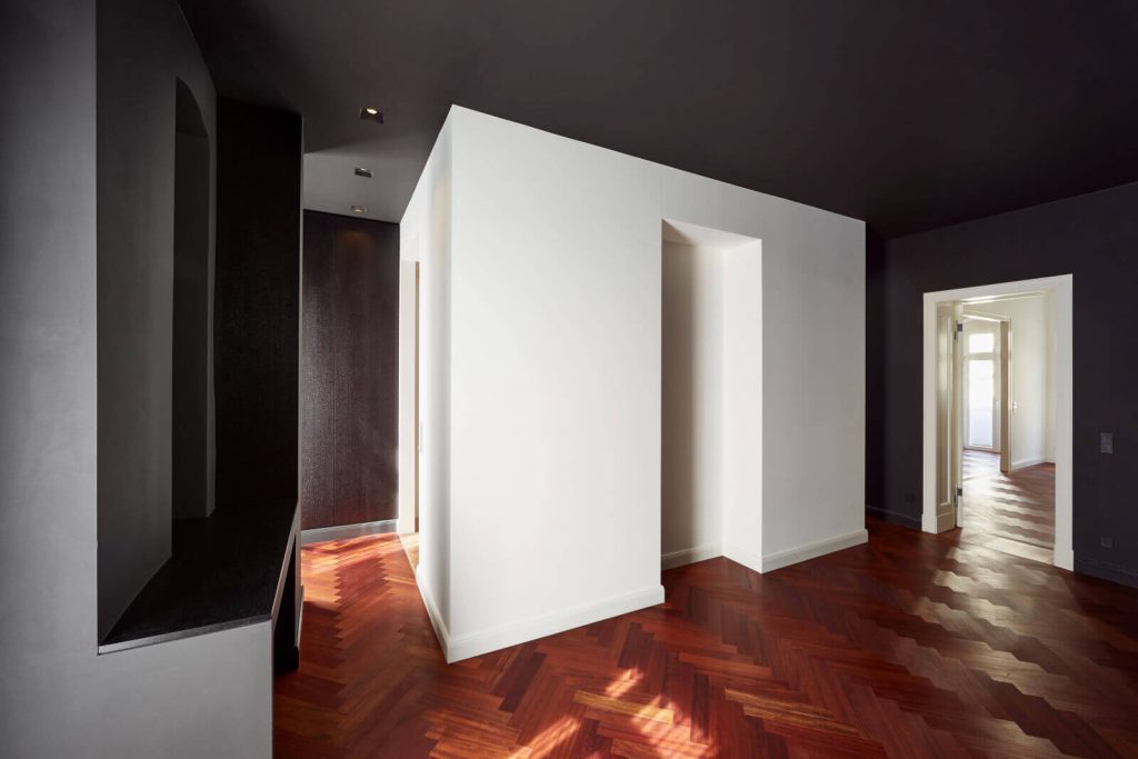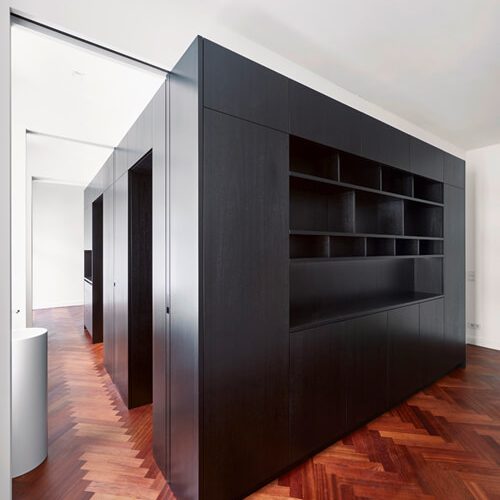 In Berlin-Neukölln am Wartheplatz entstand eine neugedachte Altbauwohnung für einen Kunstsammler. Das neue Grundrisskonzept wird von zwei implantierten Raum-Körpern bestimmt. Einem multifunktionalen Raum-Möbel, in dem in den zur Straße gelegenen Räumen Küche, Garderobe, Hauswirtschaftraum, Gäste-WC, Bibliothek, Regal und Schrank in einem untergebracht sind. Es birgt Schiebetüren in sich, so dass es ein freies Objekt im Raum ist, aber auch vier verschiedene Räume umlaufend ausbilden kann.