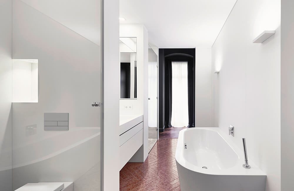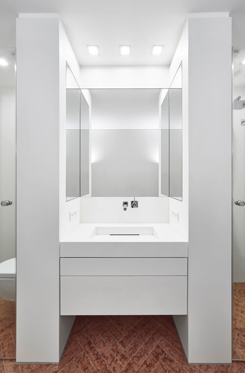 Großformatige Fliesen für die Wände, das Waschbecken und Einbaumöbel betonen die monolithische Raumwirkung.