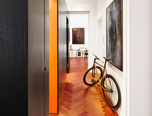 Der Hauswirtschaftsraum im Inneren des schwarzen Kubus ist komplett orange, bricht den starken Schwarz-Weiß-Kontrast und schafft eine Verbindung zu dem markanten Holzboden.