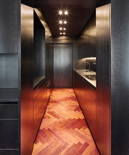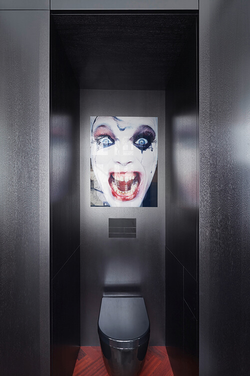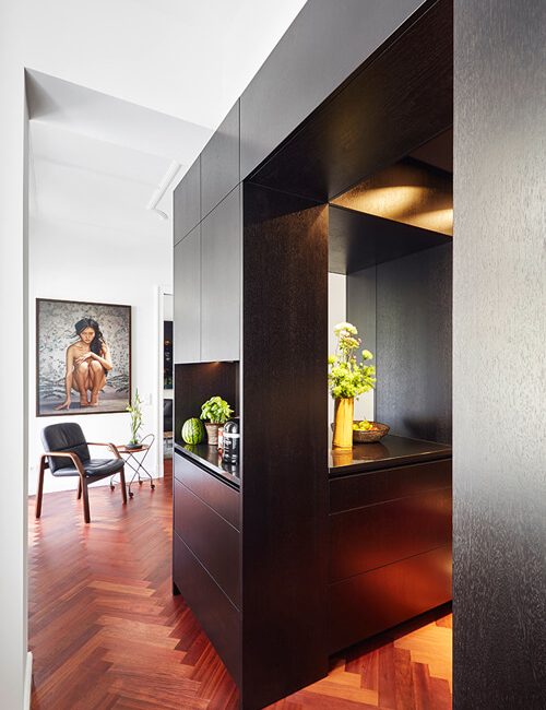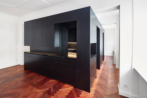 Der im Inneren gelegene Hauswirtschaftraum bekam eine eigenständige Farbe und betont so das Raum-in-Raum-Prinzip des Konzeptes. Die Küche liegt ebenfalls im Inneren des Kubus. Diese verbindet sich durch inszenierte Öffnungen mit dem den Kubus umfließenden Raum. Schwarz gebeiztes Holz unterstreicht den objekthaft monolithischen Charakter. Der Raumkörper gliedert den Grundriss und bündelt verschiedene Funktionen, so dass die Wände frei für die Kunst bleiben.