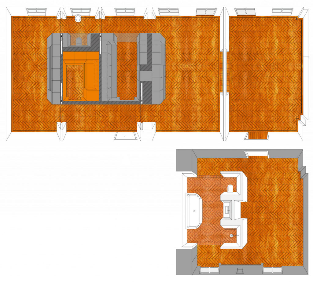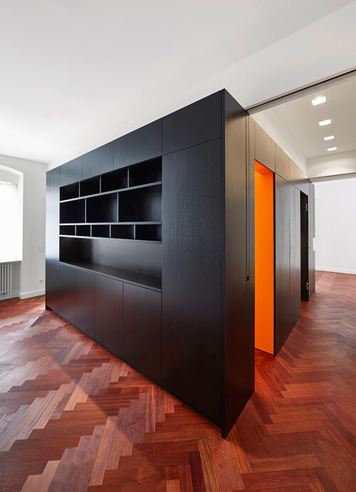 Versteckte Kleiderschränke finden zu beiden Seiten des weißen Kubus Platz und nehmen die Farbe Orange wieder auf.