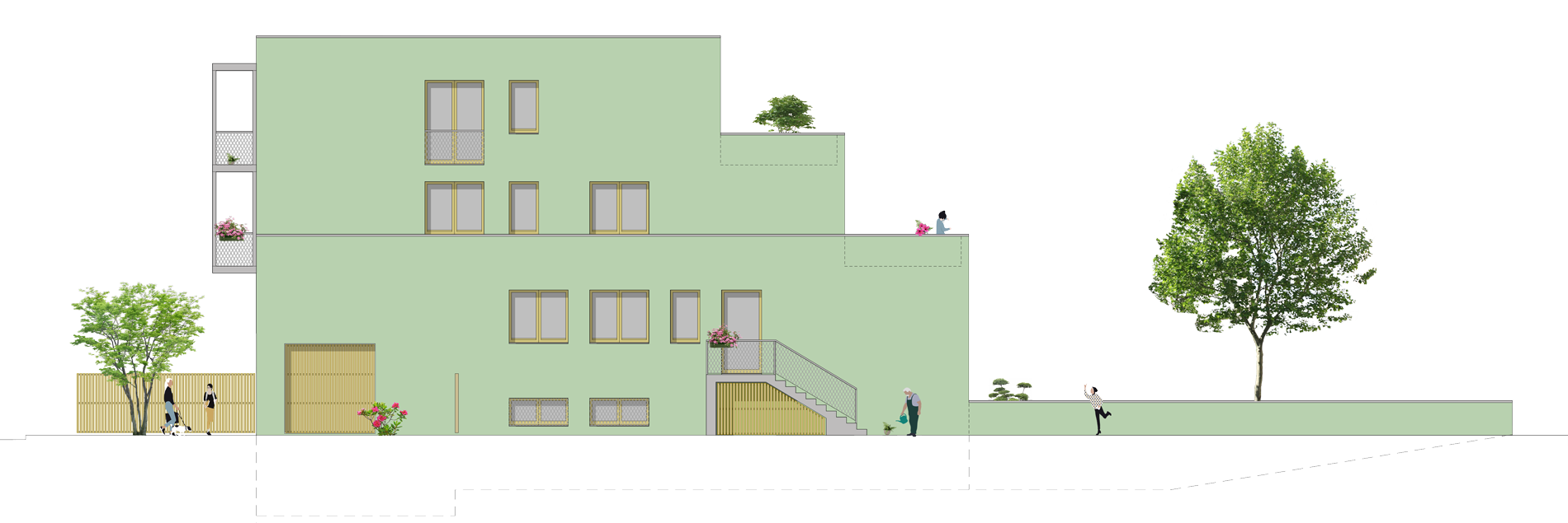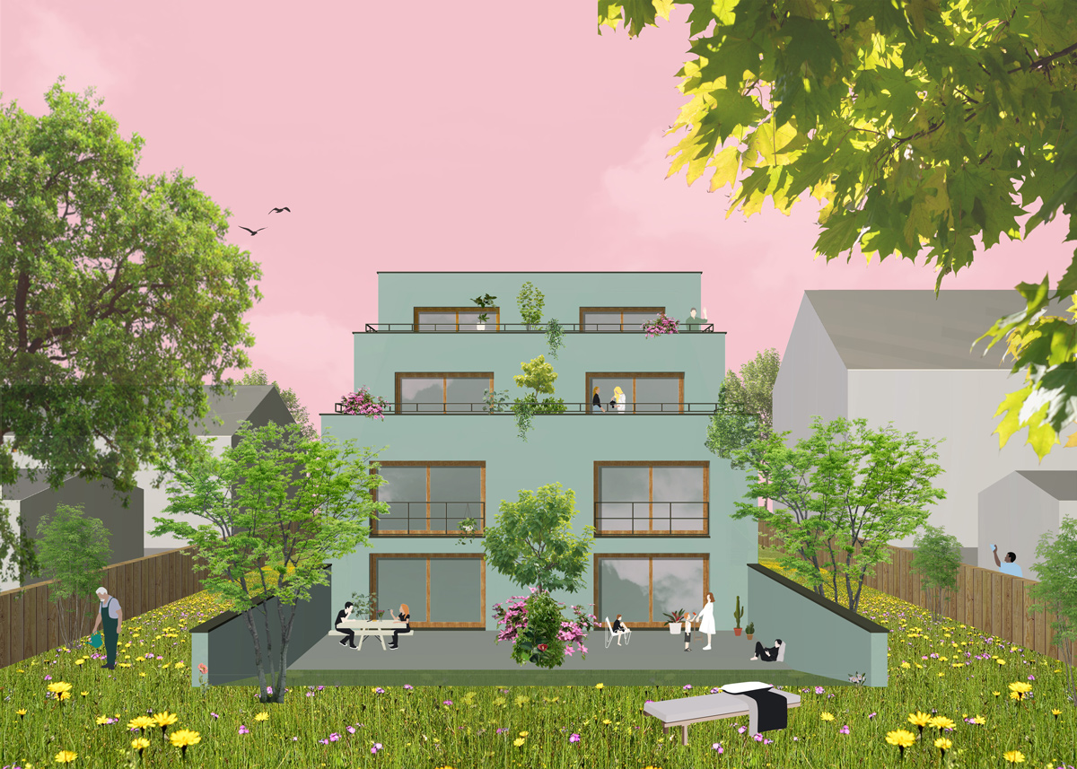 Die Idee zu der Studie war die Überlegung der beiden Nachbareigentümer ihre Grundstücke zusammenzulegen, um mehr Potentiale zu schaffen. Der Baukörper – 10m breit und 29m tief – passt sich an das lange und schmale Grundstück an und nutzte die bebaubare Fläche exakt aus. 6 Wohnungen, zum Teil als Maisonette konzipiert, finden Platz. Durch die Staffelung entstehen Terrassen mit dem Bezug zum sehr tiefen Grundstück und zur Natur. Wenn die Stellplatzverordnung angepasst wird, können die Doppelparker zu einer Gewebeeinheit umgebaut werden.
